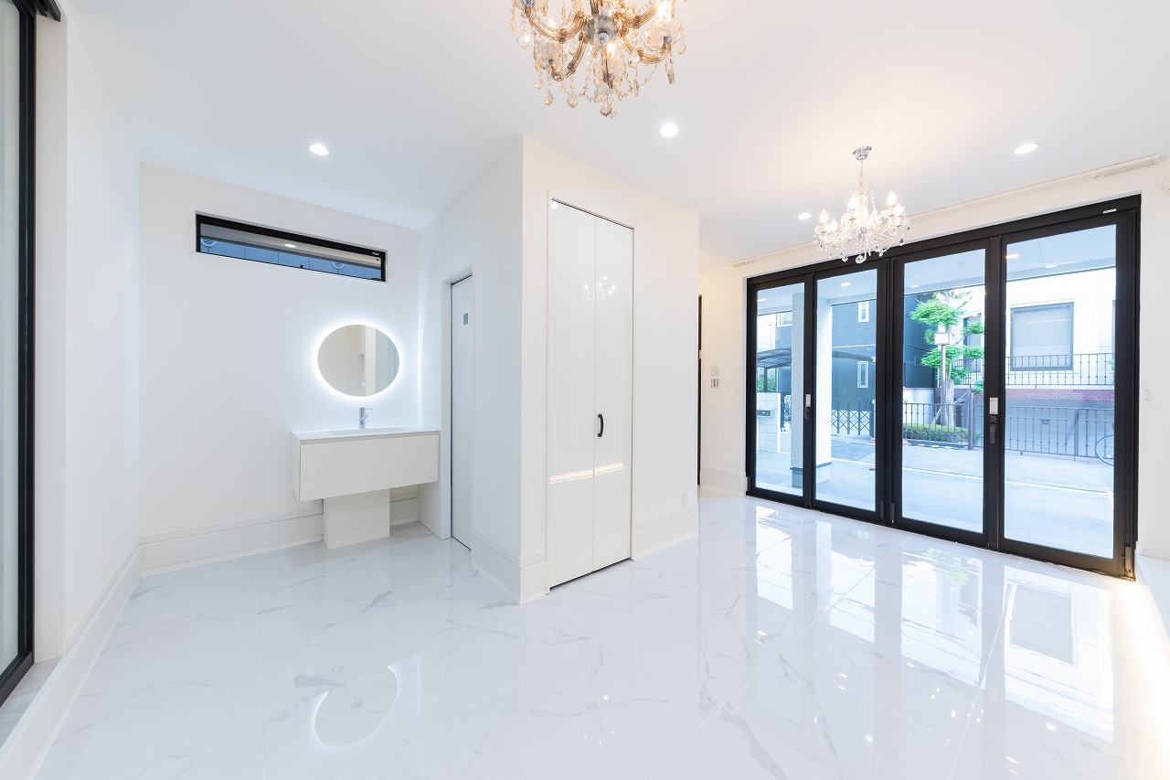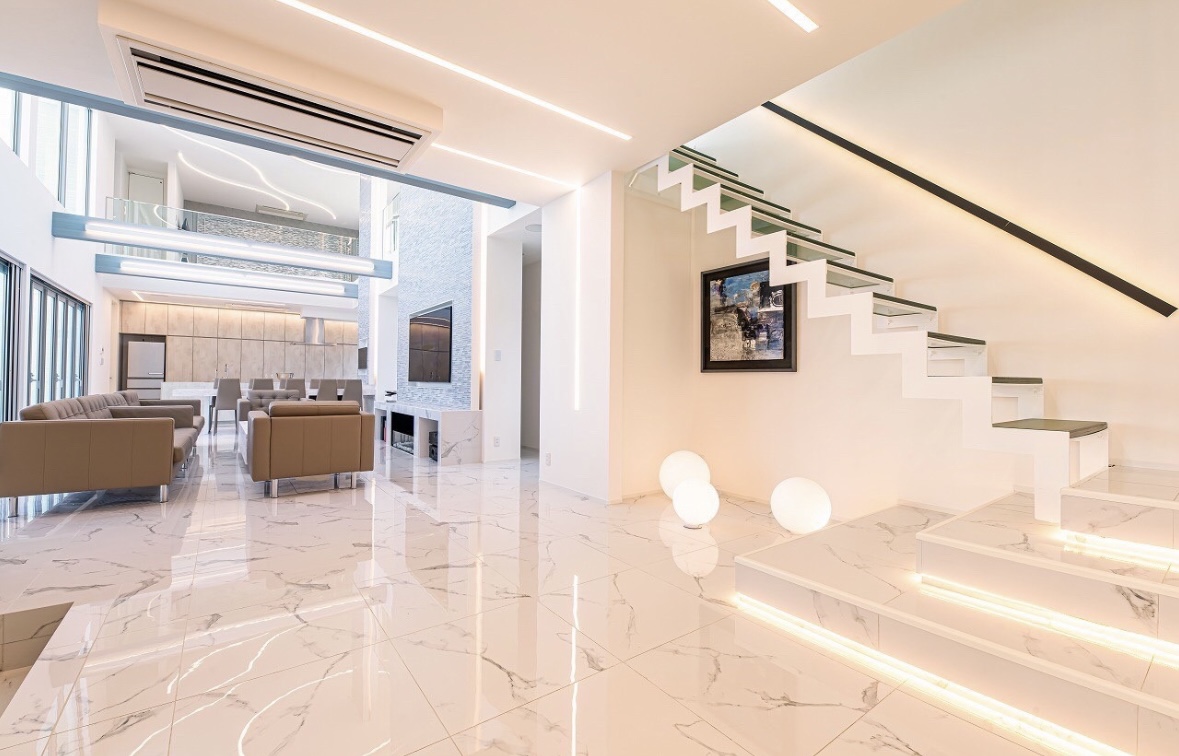 鏡面マーブル柄タイルは、デザイン性と実用性を両立した床材です。