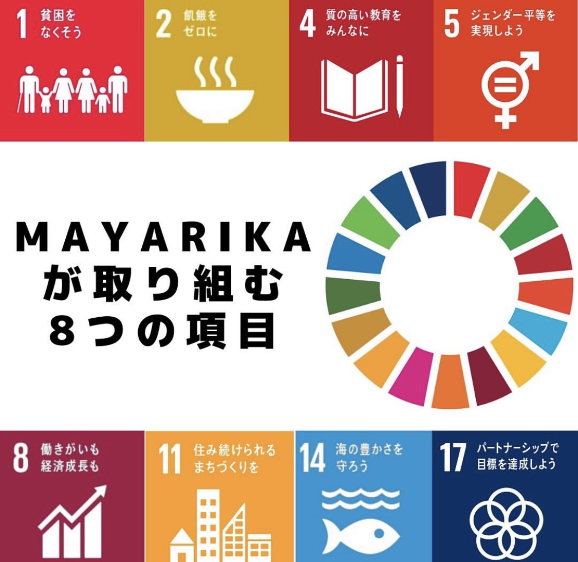 私達はSDGsの”持続可能な開発目標”の考え方に賛同し、 MAYARIKAとして独自の活動をしております。