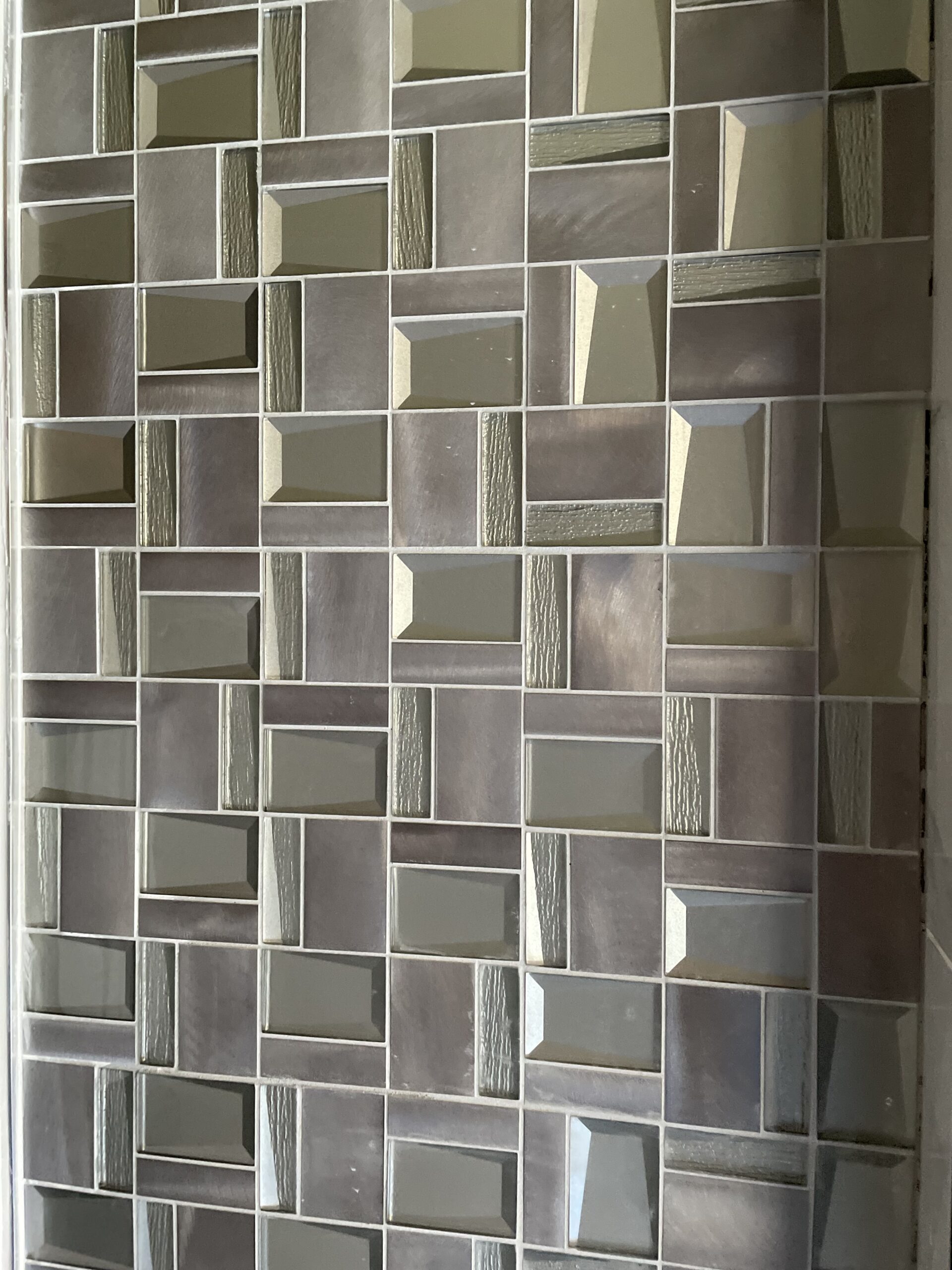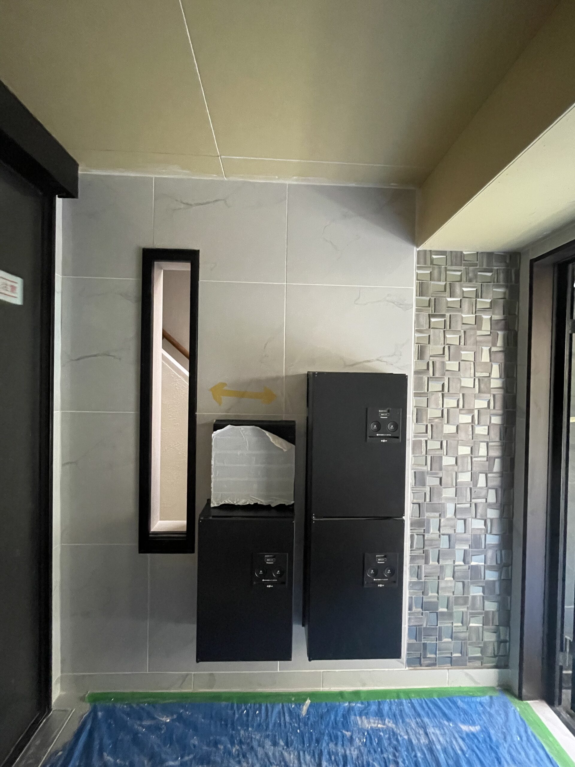 マンションエントランスに貼られた鏡面マーブルタイル(600角)とガラスタイル(300mm×300mm)の組み合わせが